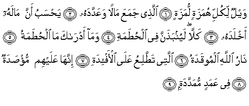 Surənin ilk ayələrindən də anladığımız kimi Allah, malın əbədi yaşadacağı zənni ilə sərvət toplamağı və insanları lağa qoymağı şiddətlə rədd edir.